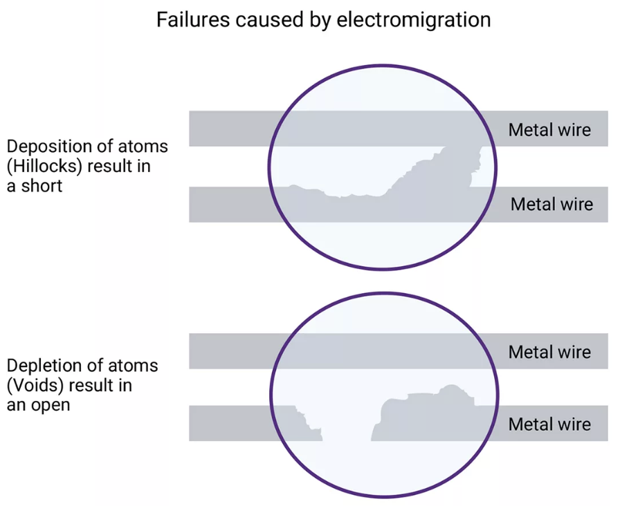 Electromigration (EM) is the movement of atoms based on the flow of current through a material. If the current density is high enough, the heat dissipated within the material will repeatedly break atoms from the structure and move them. This will create both ‘vacancies’ and ‘deposits’. The vacancies can grow and eventually break circuit connections resulting in open-circuits, while the deposits can grow and eventually close circuit connections resulting in short-circuit.