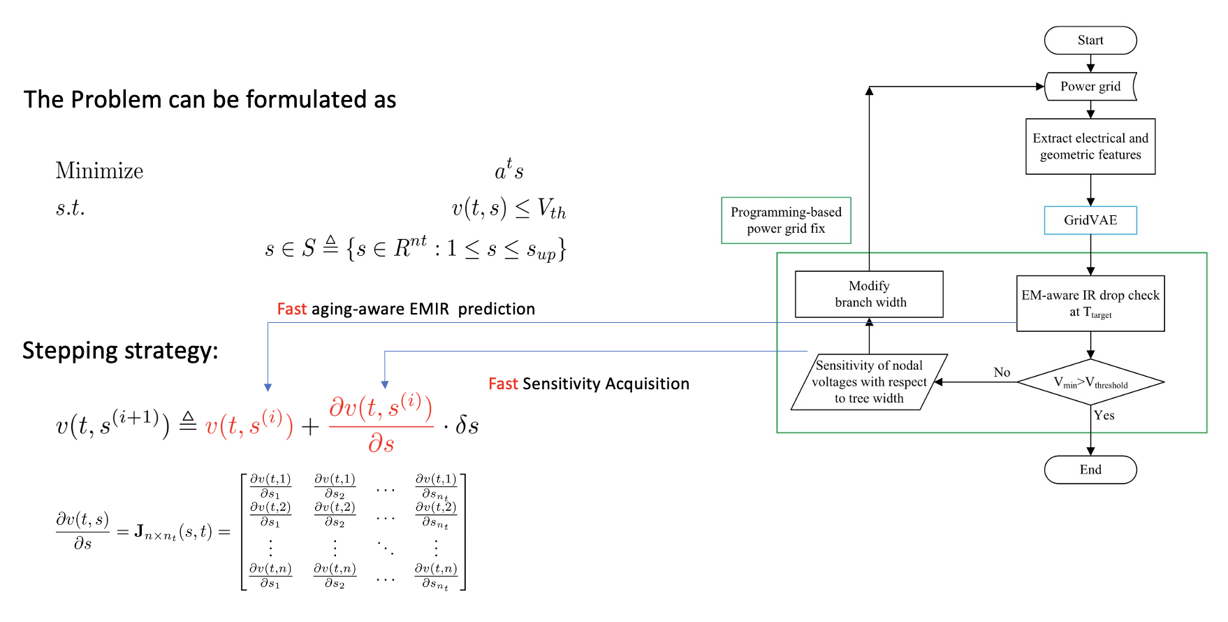 Problem formulation: With the power grid information at T = 0 as our starting point, we set out to predict the EMIR drop at the target aging lifetime T = t. Our goal is not just to predict, but to alleviate revealed EMIR drop failure by resizing the power grid interconnection trees’ width with a minimum metal area increase. This scenario can be considered as an non-linear optimization problem.